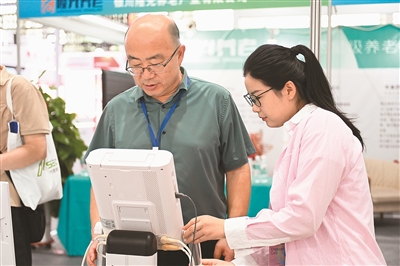 2024宁夏养老服务业博览会近日在宁夏银川市举办。本届博览会集中展示国内外养老服务前沿科技和最新成果,推动健康养老产业向更深层次、更宽领域、更全方位发展。图为会上工作人员向参观者介绍医疗产品。新华社记者 毛 竹摄