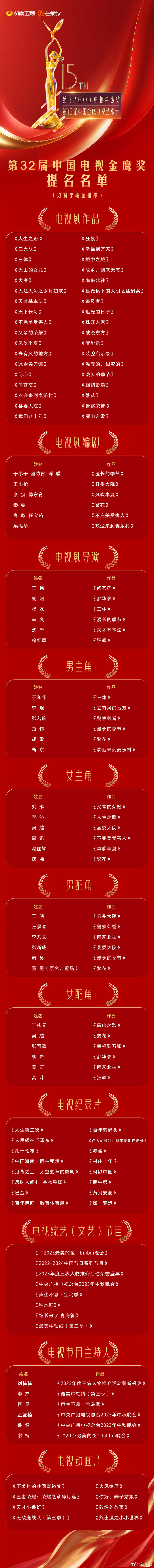 第32届金鹰奖提名名单终于揭晓!10月20日19:30第15届金鹰节颁奖晚会,一起期待他们在金鹰奖的舞台上绽放光彩!(记者:张玉洁)