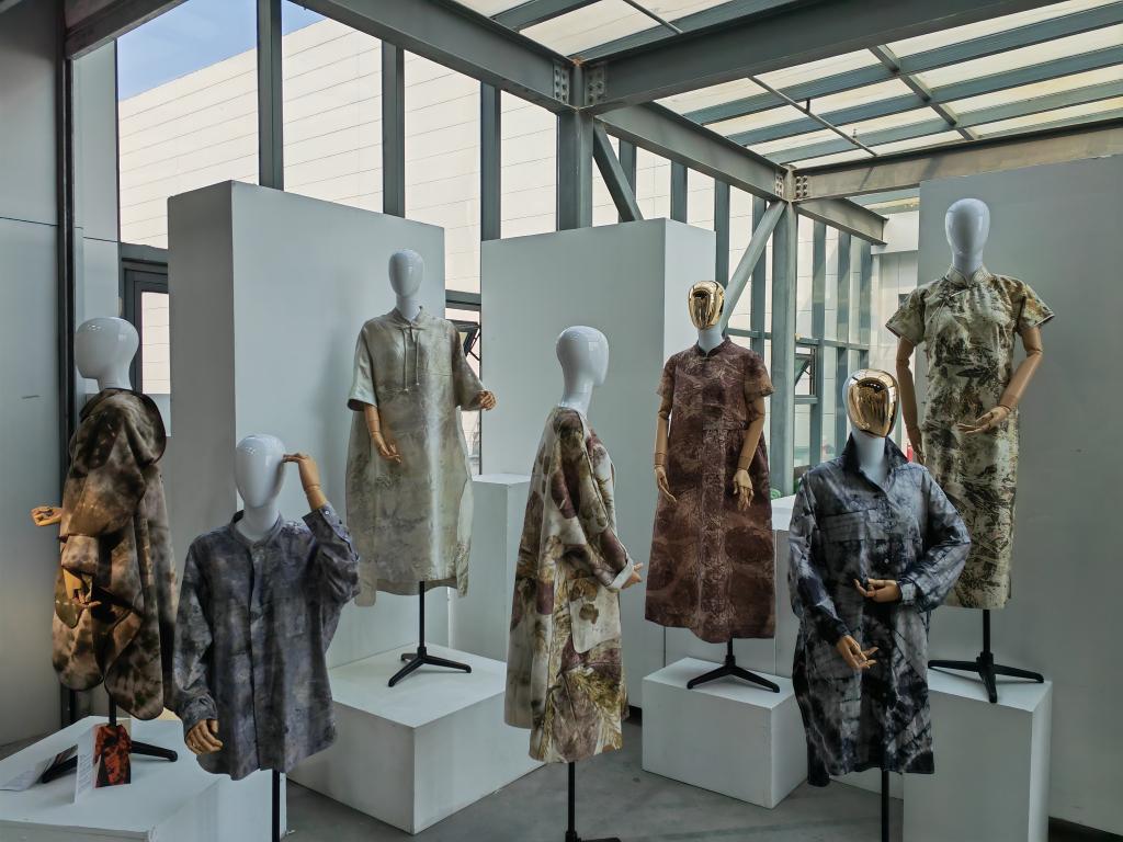 董昕说:“我们采用植物热转印工艺,通过高温蒸煮把植物的形状、肌理和颜色转印到织物上,创造出独一无二的图案,传递出植物本身的自然气息和生命力。观众可以沉浸式感受色彩与图案带来的视觉享受,想象自己穿着这样一件衣服的美感。”
