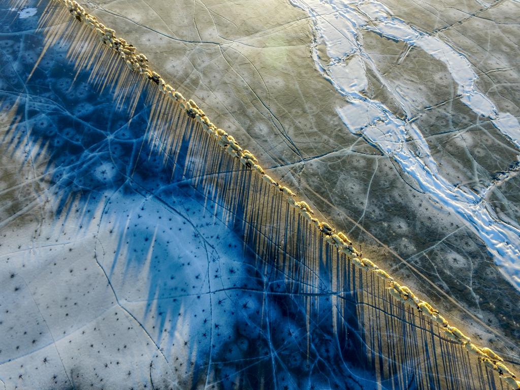 2017年2月9日,太阳露出地平线,羊群在冰面投下纤长的蓝色影子。每年高原最冷的时刻,有“仙女眼泪”之称的普莫雍错封冻成冰湖,西藏山南市浪卡子县堆瓦村牧人迎来最佳的羊群转场时机。这种转场牧业方式,在这片离天最近的地方已延续了上千年。新华社记者 普布扎西 摄