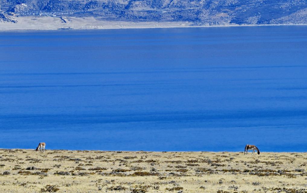 2023年10月28日,藏野驴在佩枯错畔觅食。新华社记者 张汝锋 摄