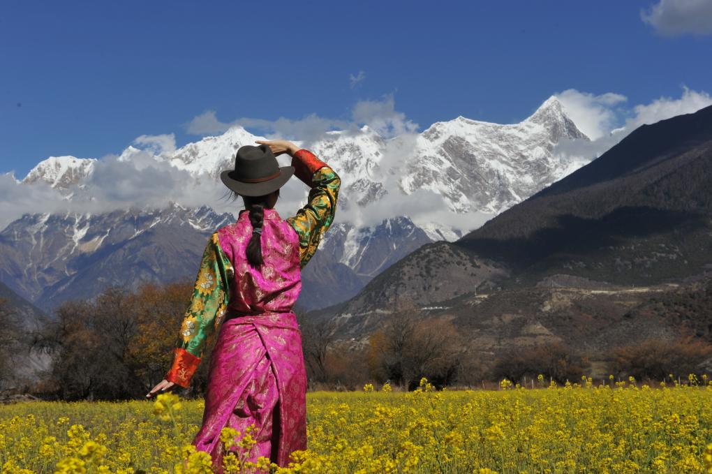 2019年11月27日,身着藏式服装的游客来到油菜花田,远眺初露峰顶的南迦巴瓦峰。新华社记者 侯捷 摄
