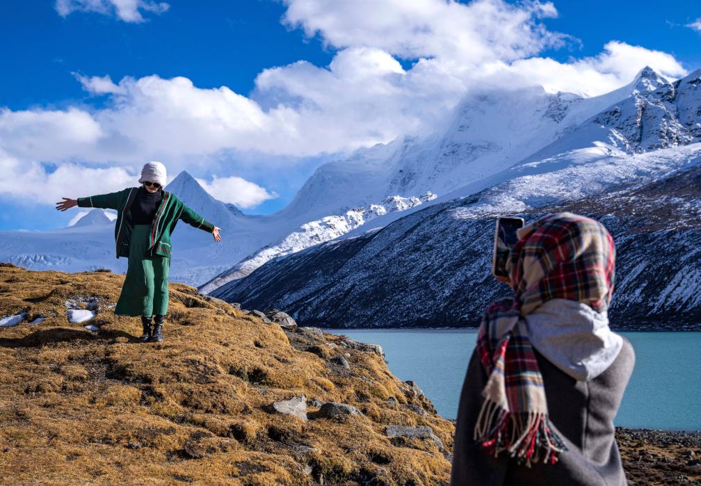 2023年10月28日,游客在萨普雪山脚下拍照留念。新华社记者 孙非 摄