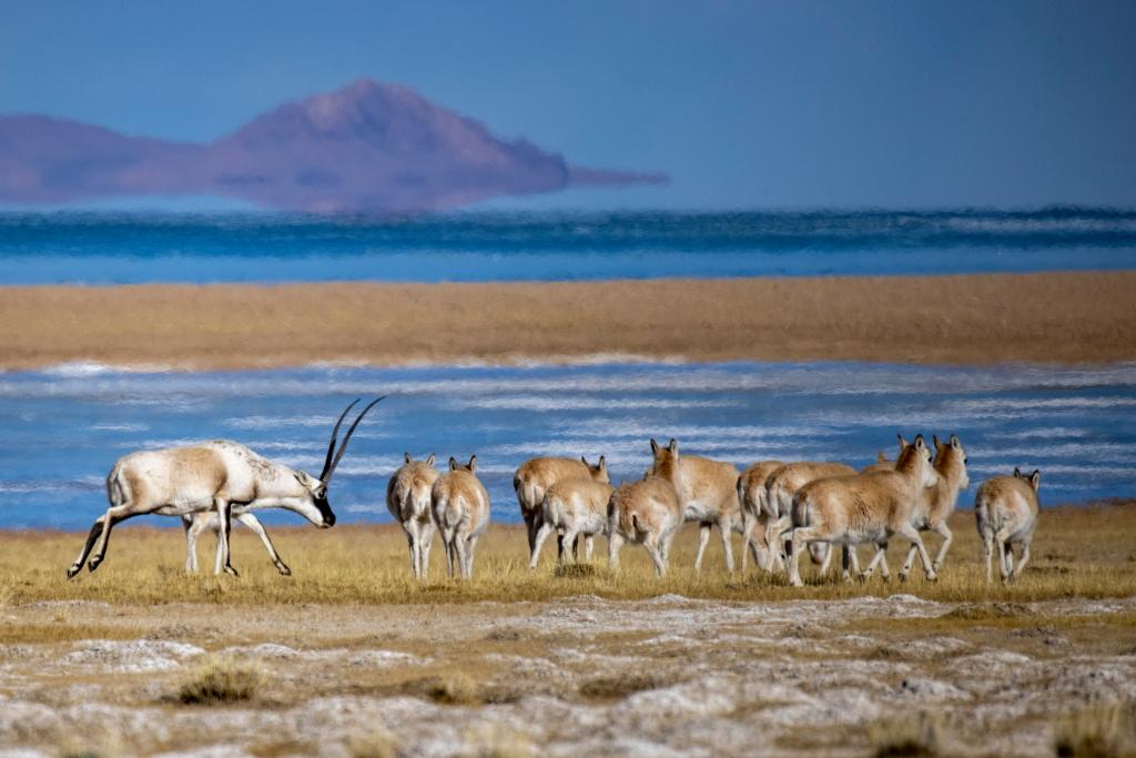这是2024年1月5日在色林错湖畔拍摄的藏羚羊。新华社记者 姜帆 摄