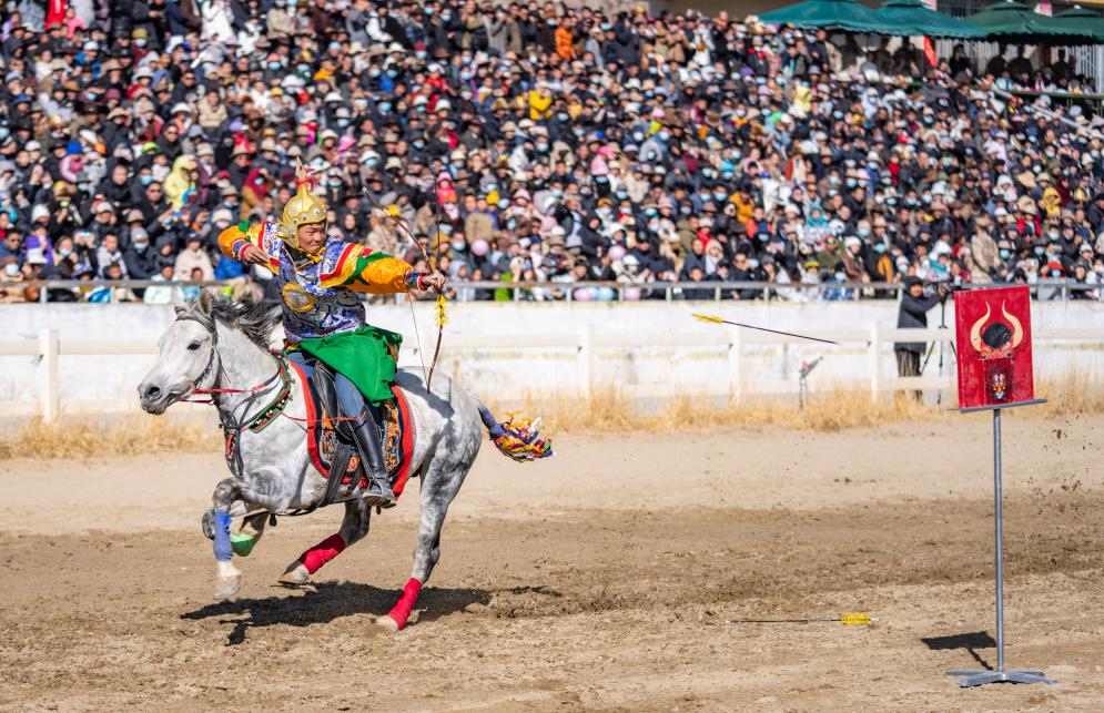 2024年2月12日,在拉萨赛马场,骑手表演马上射箭。新华社记者 孙非 摄