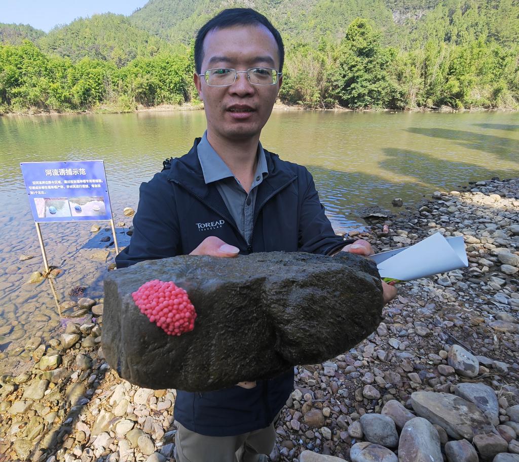 贵州省生物研究所副研究员吕敬才给群众讲解福寿螺的繁殖习性(2024年10月30日摄)。新华社记者李黔渝 摄