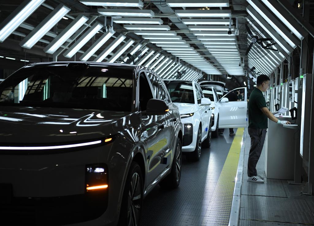 在江苏常州理想汽车智能制造基地总装车间,工作人员在检查车辆外饰(2024年5月31日)。新华社记者 柳文惠 摄
