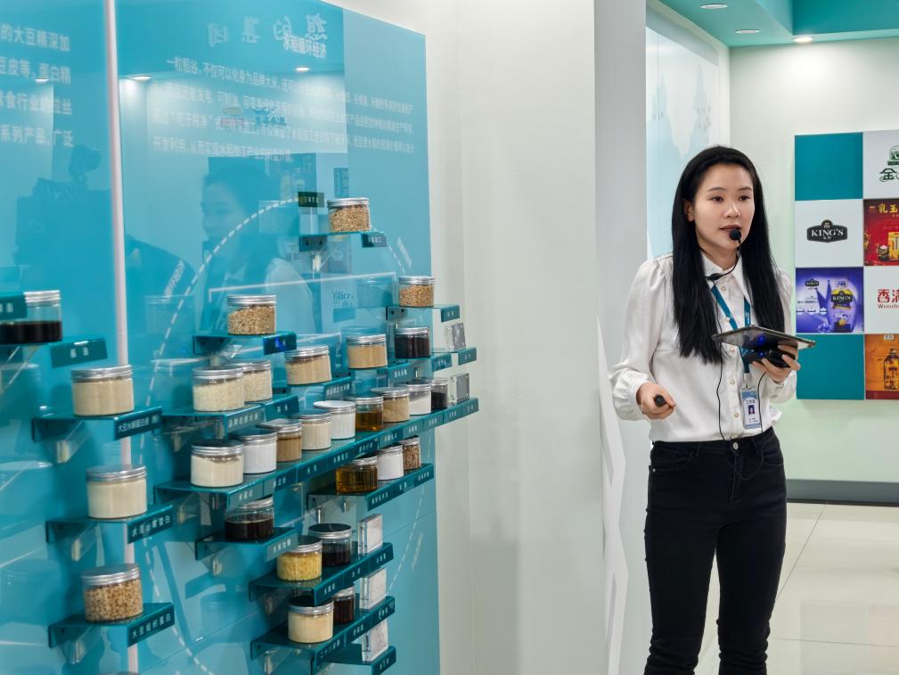 益海嘉里(哈尔滨)粮油食品工业有限公司工作人员介绍公司水稻产业链条。新华社记者孙晓宇 摄