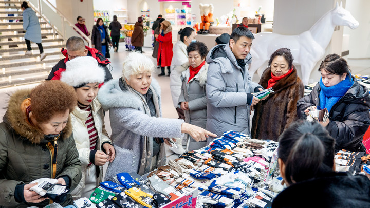 新华社长春2月1日电(记者段续、李典、唐成卓)眼下正值蛇年春节假期,热闹的年货市场中人头攒动。在有着“中国袜业名城”之称的吉林省辽源市,一双双火红的棉袜,悄然成为东北地区年货的“香饽饽”,成为人们过年期间走亲访友的“必备”年货之一。