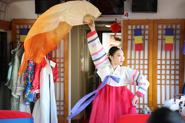 春节期间,演员在“龙井号”文旅专列的朝鲜族风情车厢表演朝鲜舞。受访者供图