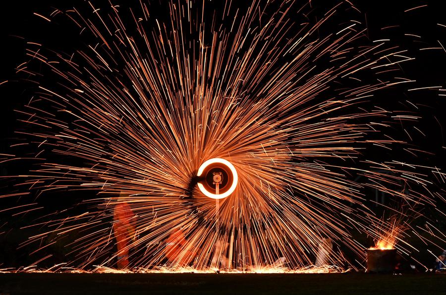 2月1日,民间艺人在浙江省金华市武义县花田美地景区表演打铁花。新华社发(张建成摄)