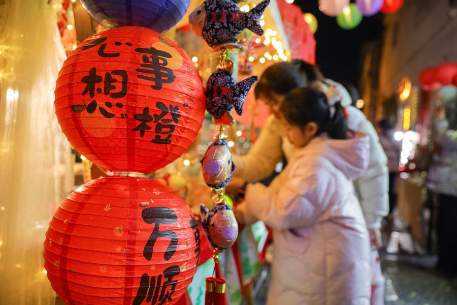 1月29日晚,游客在浙江省湖州市吴兴区小西街选购文创商品。新华社发(张鹰摄)