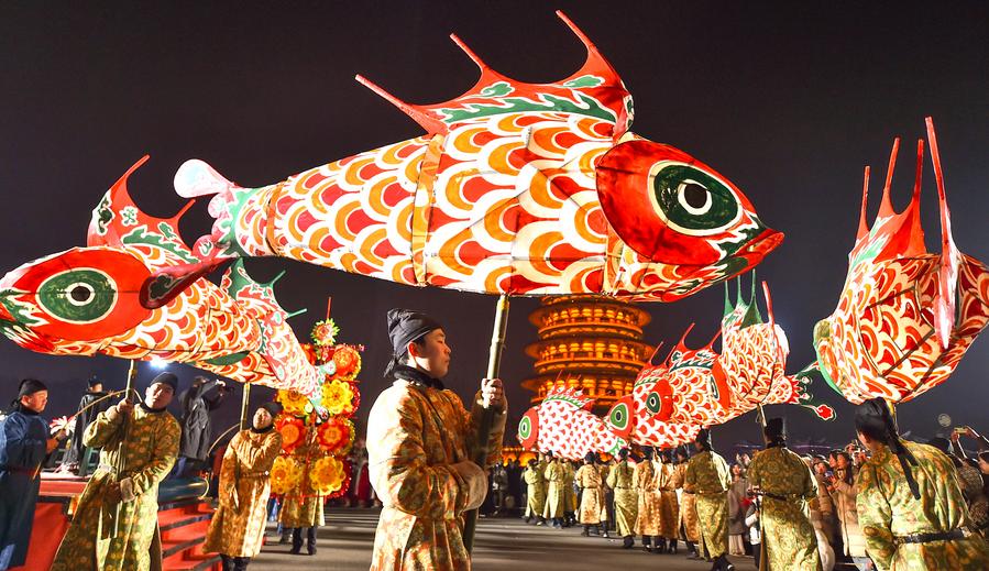 1月31日晚,非遗鱼灯会表演队伍在河南省洛阳市隋唐洛阳城国家遗址公园明堂景区内巡游。新华社发(黄政伟摄)