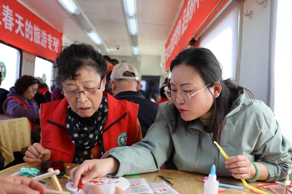 4月6日,在齐鲁之星“游学养”银发专列上,乘客与工作人员一起做非遗衍纸画。(受访单位供图)