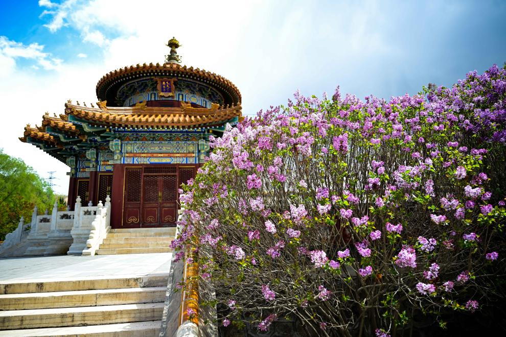 在西宁市北山美丽园,大量市民入园赏花,环游青甘大环线的游客也选择在此留下记忆。古色古香的亭台旁,散步慢跑的步道侧,到处是花团锦簇的丁香。