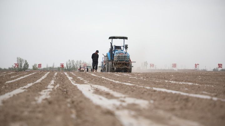 制种玉米进入春播期,工人在五个墩村播种。新华社记者张睿摄