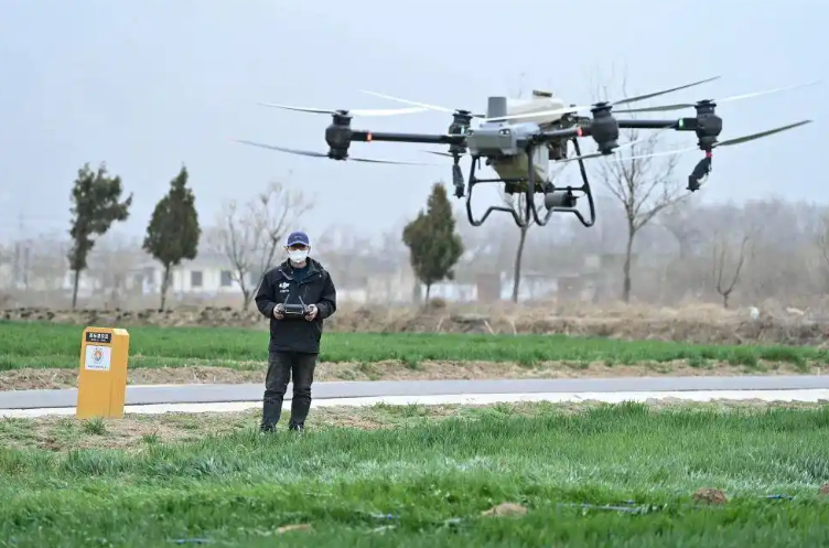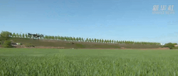 在山西省泽州县金村镇霍秀村麦田里,无人机盘旋在上方。