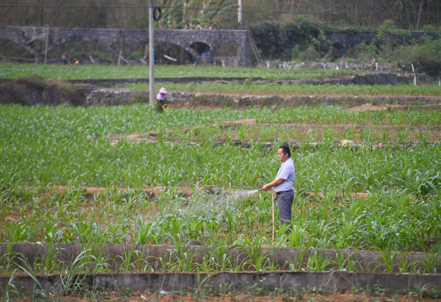 4月21日,广西都安瑶族自治县地苏镇上节村村民在给玉米浇水。新华社记者 黄孝邦 摄