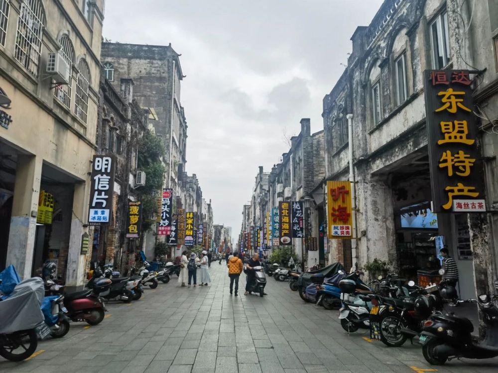 漫步在老街,可以感受不一样的市井风情,老人躺在摇椅上摇着蒲扇哼着疍家咸水歌,街坊邻居聚在一起聊天、打牌,一条条通海巷陌里游人如织……商铺斑驳的门楣上,依稀可见昔日繁华。那些曾经在此经商的人们,带着南洋的财富与文化,将这条老街装点得活色生香。