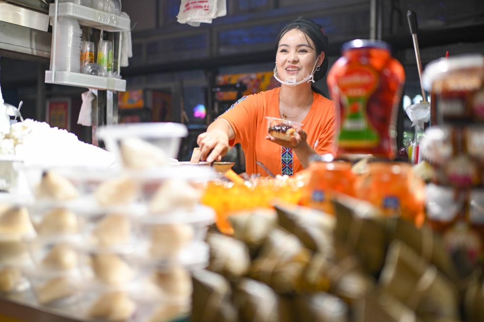 ↑2024年6月4日,在新疆和田夜市,商户麦斯图热姆·阿卜杜穆柯依提为顾客制作酸奶粽子。新华社记者 胡虎虎 摄