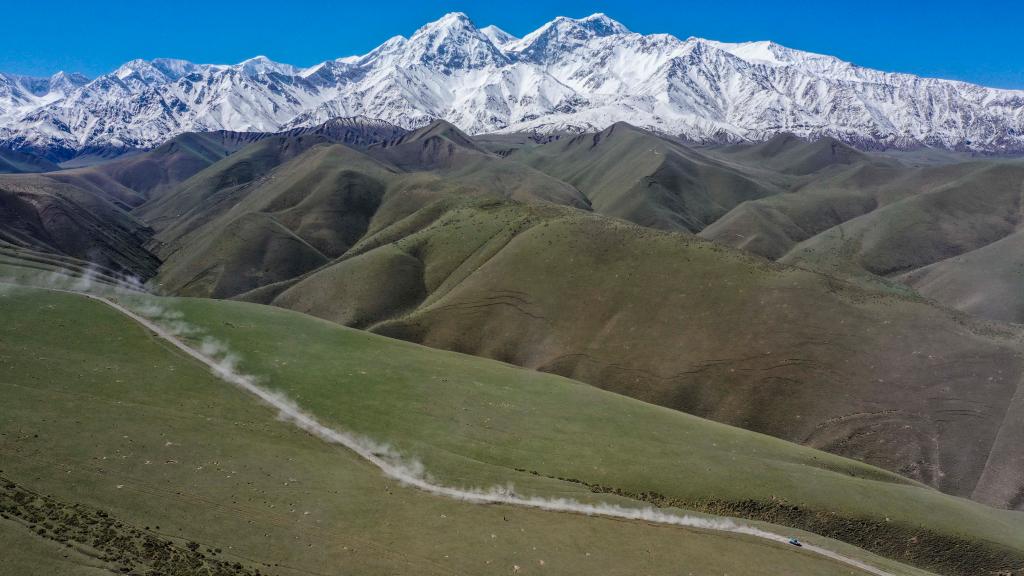 ↑2019年5月31日,在新疆和田地区策勒县昆仑山区,一辆环塔赛车疾驰在赛道上,远处的昆仑雪山清晰可见(无人机拍摄)。新华社记者 胡虎虎 摄