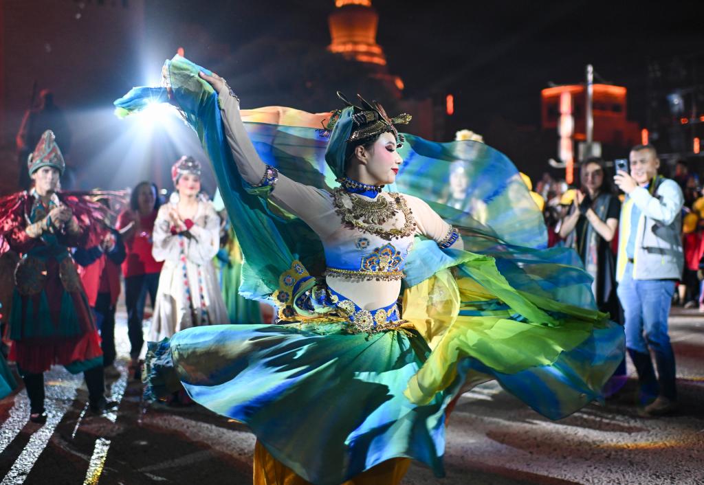 ↑2023年6月1日,在新疆和田地区约特干故城景区,2023年环塔拉力赛参赛代表参加旅游展示活动。新华社记者 胡虎虎 摄