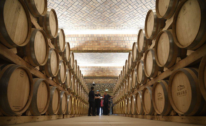在位于贺兰山东麓的志辉源石酒庄,游客在酒窖参观游览。新华社记者王鹏摄