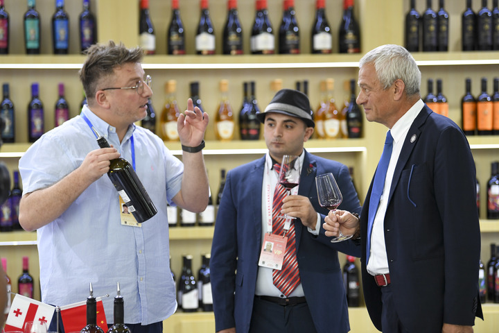 在银川国际葡萄与葡萄酒产业大会上,嘉宾在展会现场品鉴葡萄酒(2023年6月9日摄)。新华社记者冯开华摄