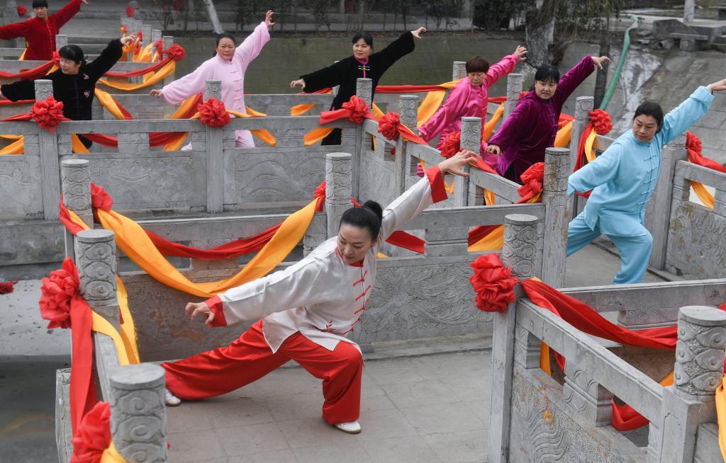 2019年2月22日,五禽戏老师陈静(前)在安徽亳州华祖庵内教群众五禽戏。新华社记者 张端 摄