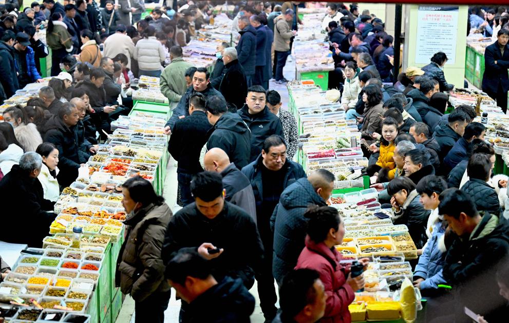 2025年2月15日,药商在中国亳州中药材专业市场内选购药材。新华社发(刘勤利 摄)