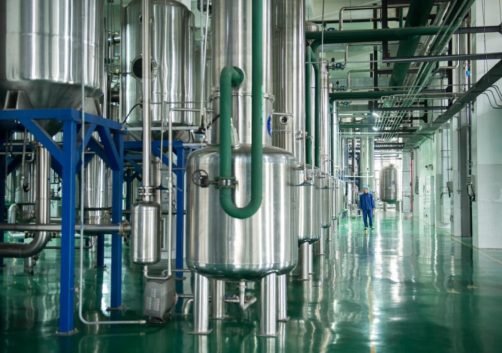 2024年11月10日,在华佗国药股份有限公司的中药智能化提取车间,工作人员查看设备运行情况。新华社记者 傅天 摄