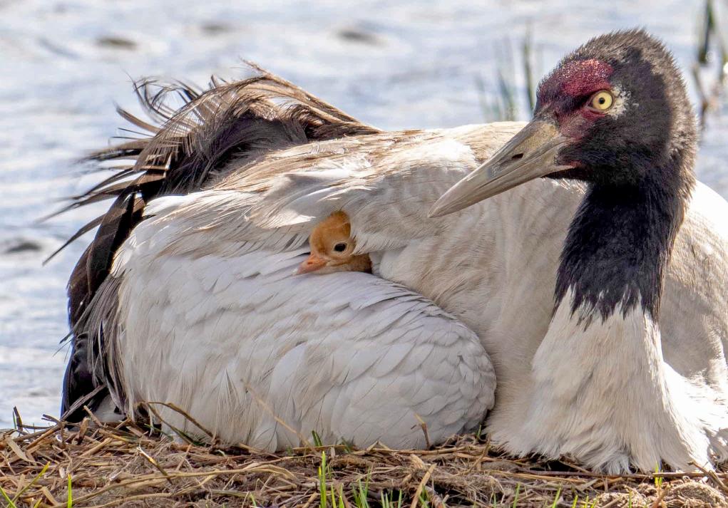 一只黑颈鹤在西藏那曲市申扎县的申扎藏布湿地上照顾刚出壳的雏鸟(6月5日摄)。 新华社记者 姜帆 摄