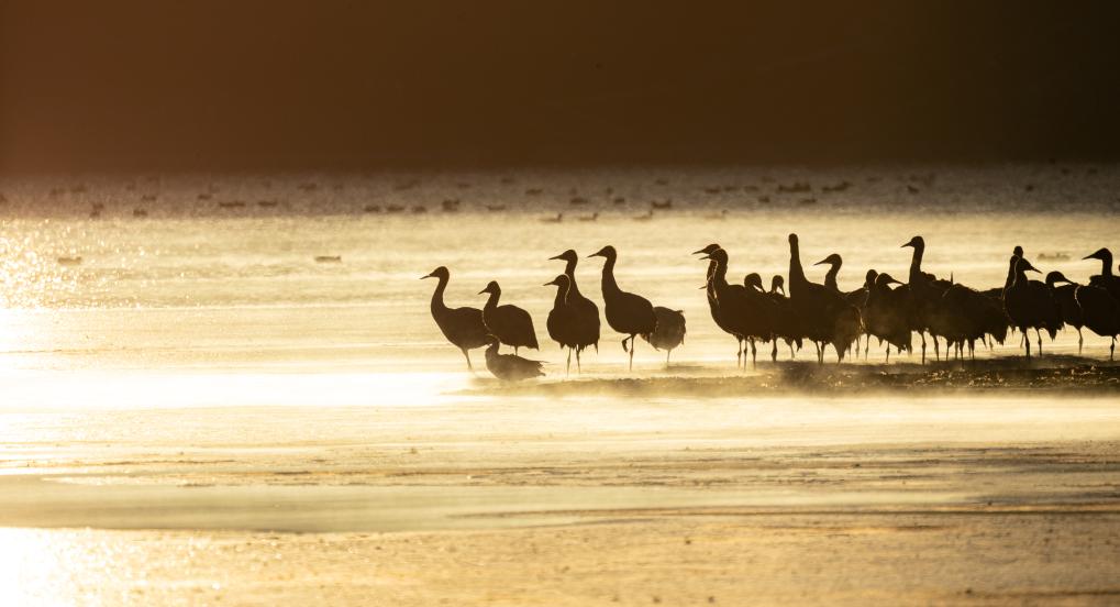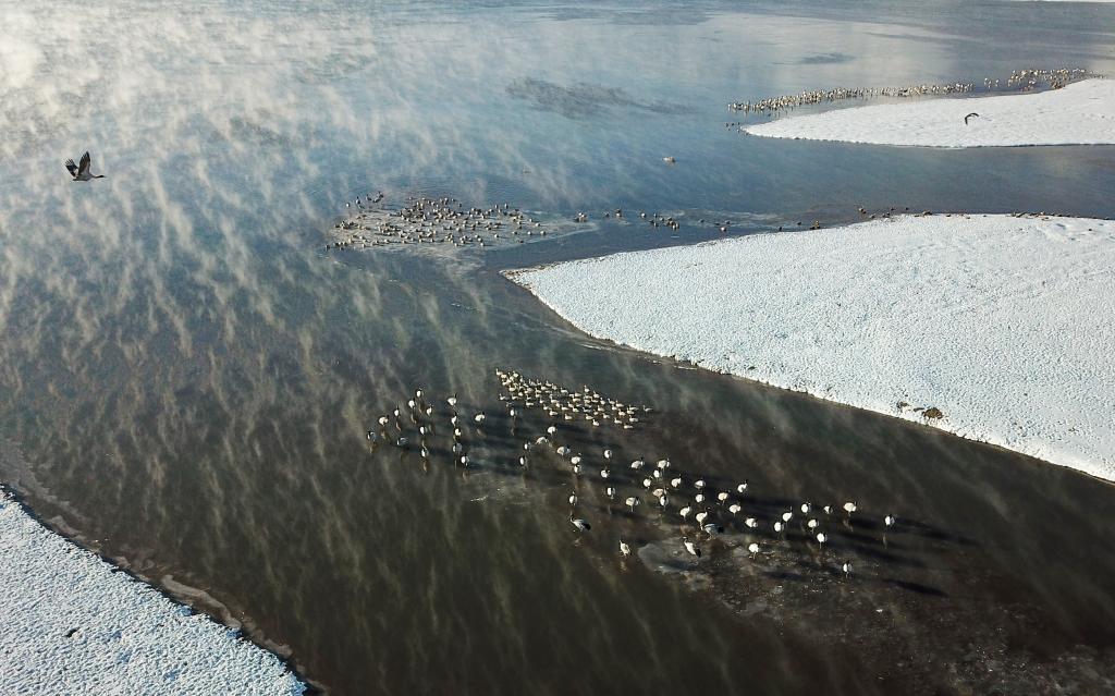 这是清晨在拉萨市林周县虎头山水库拍摄的越冬黑颈鹤。西藏拉萨市林周县位于拉萨河上游及澎波河流域,平均海拔约4200米,是黑颈鹤主要的越冬地之一(2023年12月5日摄)。新华社记者 姜帆 摄