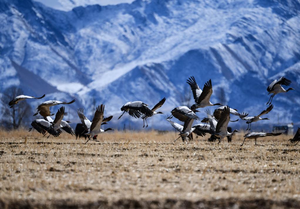 在拉萨市林周县境内越冬的黑颈鹤(2022年2月22日摄)。新华社记者 觉果 摄