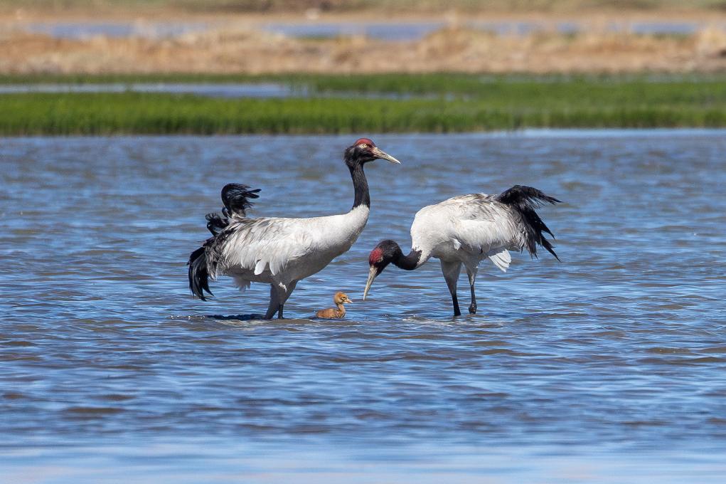 这是6月5日拍摄的那曲市申扎县周边申扎藏布湿地里栖息的黑颈鹤和出生不久的小黑颈鹤。 新华社记者 旦增尼玛曲珠 摄