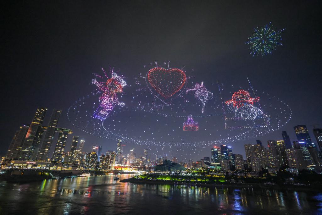 被无人机灯光秀点亮的城市夜空,成为展示大美重庆城市形象的多彩画布。