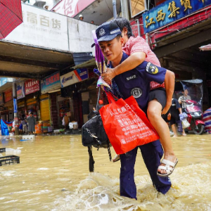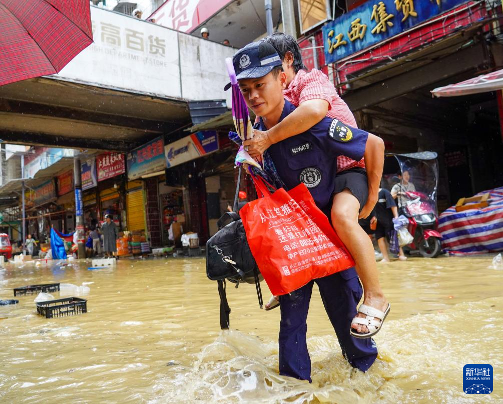 6月24日,在贵州省黔东南州从江县,救援人员将受灾群众转移至安全地带。新华社发(卢忠南摄)