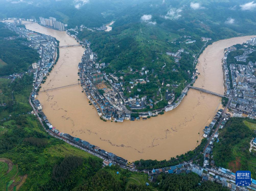6月24日拍摄的贵州省黔东南州从江县县城洪峰过境场景(无人机照片)。新华社发(吴德军 摄)
