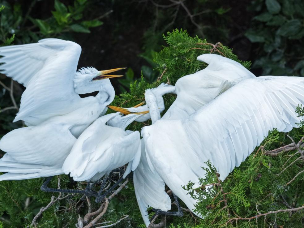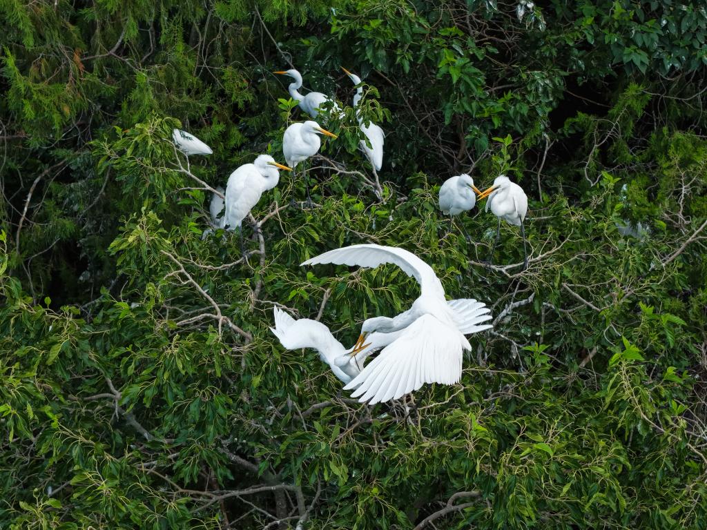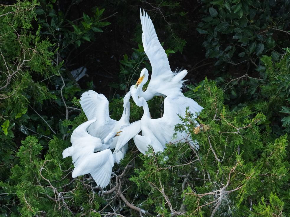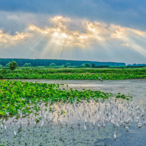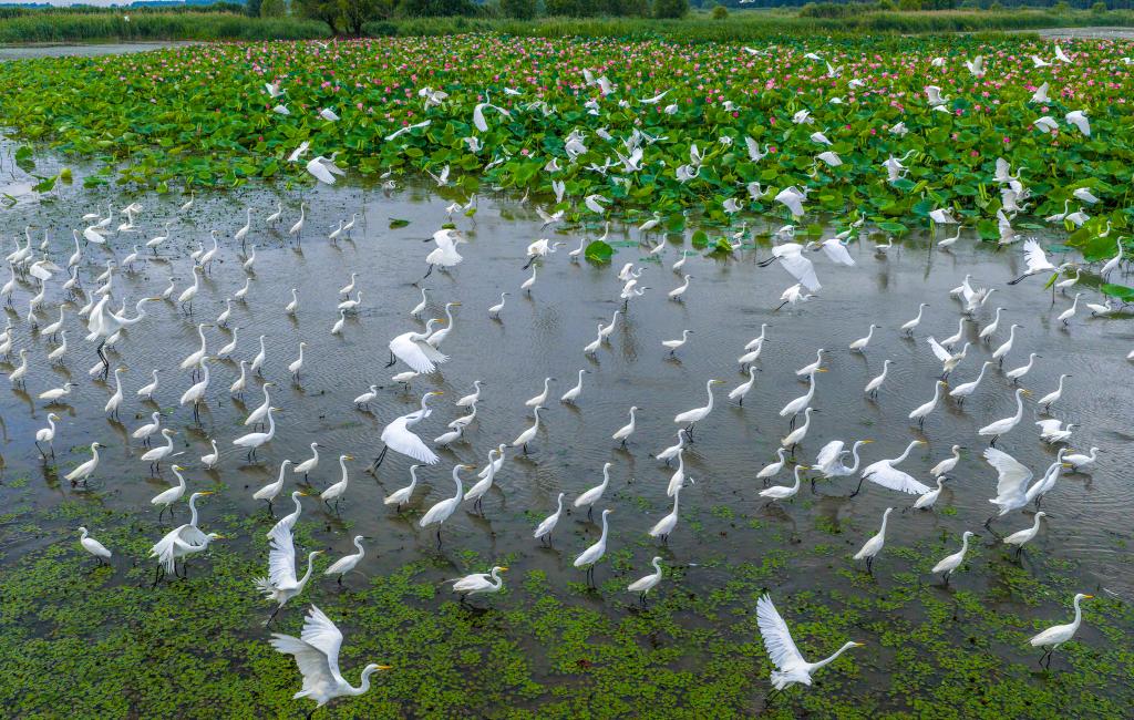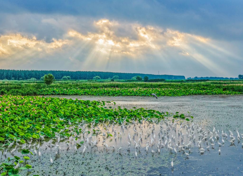 夏日的江苏泗洪洪泽湖湿地国家级自然保护区内,大批鹭鸟翩跹起舞,与天光云影相映成趣,勾勒出一幅美丽的生态画卷。