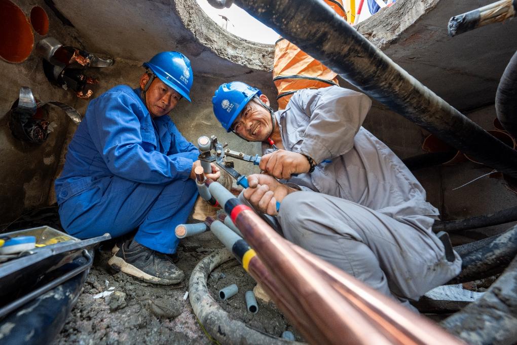 7月9日,国网绵阳供电公司市区供电中心电力员工在狭小的地下电缆井中制作电缆中间接头。(受访者供图)