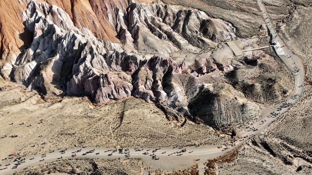 人们在甘肃省张掖外星谷星际主题地质公园参加徒步活动。新华社发(成林 摄)