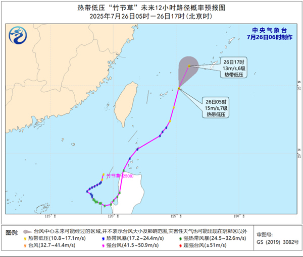 预计,“竹节草”将以每小时15-20公里的速度向北偏东方向移动,强度继续减弱。