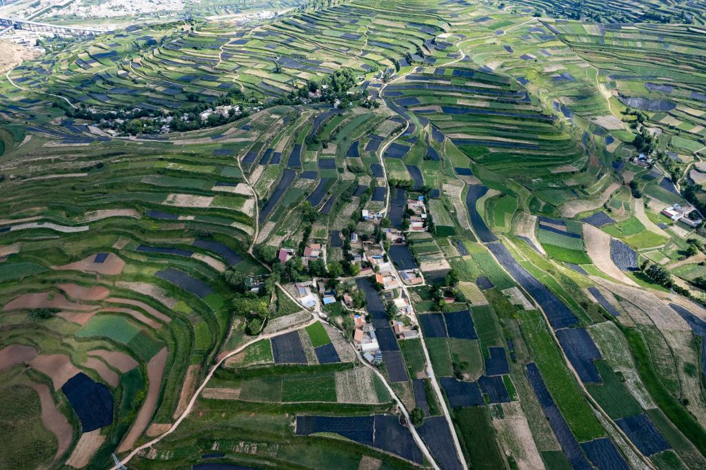 这是7月15日在甘肃省定西市岷县拍摄的梯田中生长的猫尾草等作物(无人机照片)。新华社记者 刘克英 摄