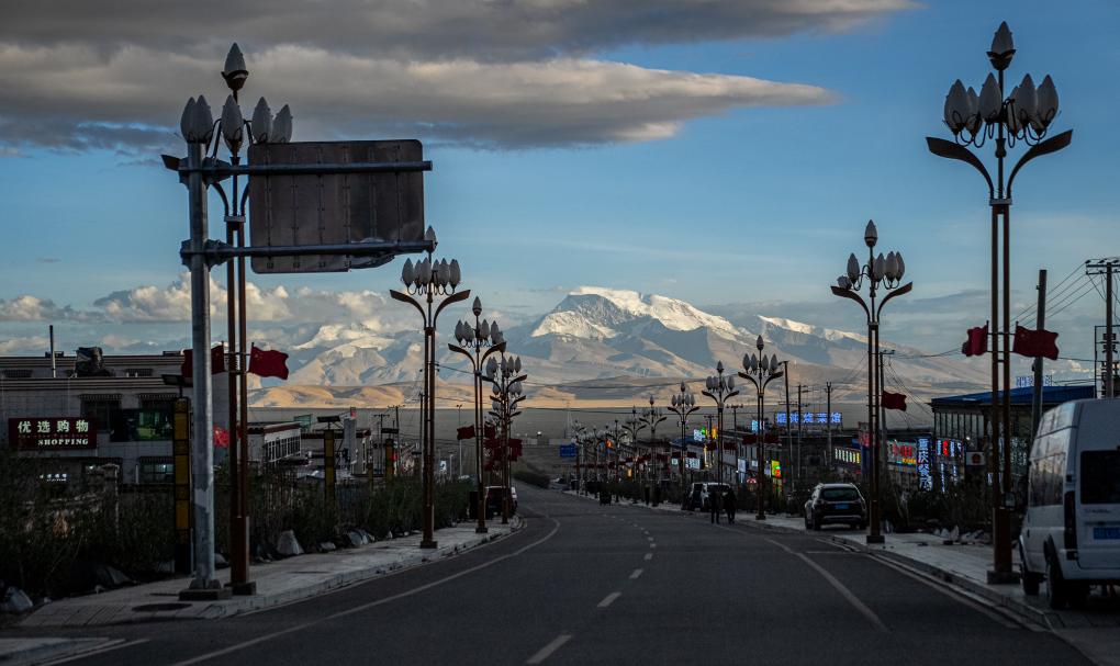 塔尔钦小镇中心街道南望,可见终年积雪的纳木那尼峰。新华社记者 丁增尼达 摄