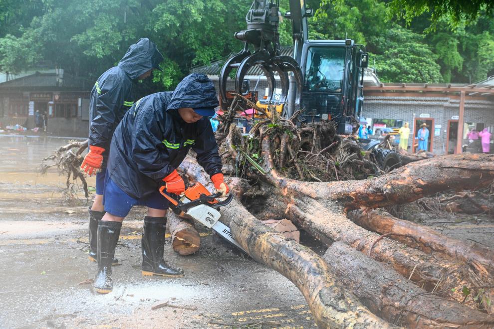 8月6日,工作人员在广东肇庆鼎湖区鼎湖山风景区门口用电锯切割被冲倒的树木。新华社记者 肖恩楠 摄