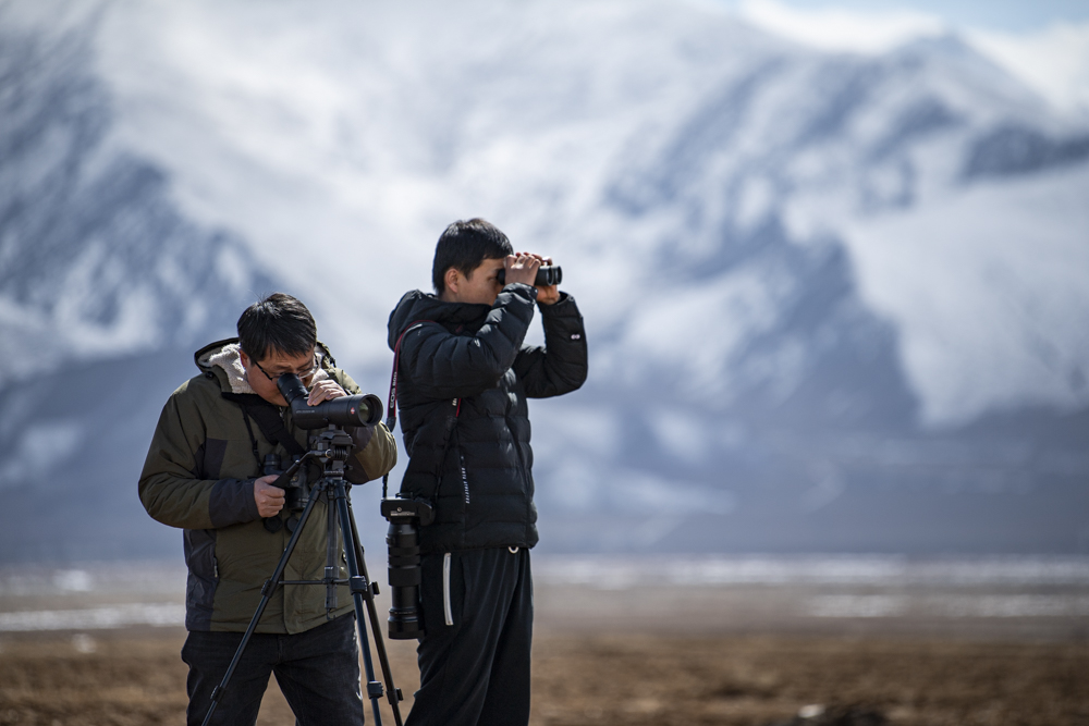 2023年3月1日,在拉萨市林周县,杨乐(左)和同事正在观察田间觅食的黑颈鹤。新华社记者孙非 摄