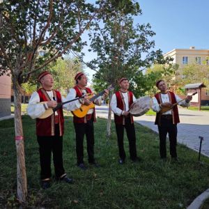 四名表演者来自达尔汗文艺队,他们身着有着浓郁民族特色的传统服饰,情绪饱满地自弹自唱。领队加尔肯别克·纳斯依奥拉怀抱冬不拉,指腹在琴弦上灵活跳跃。有的队员敲击萨满鼓,还有队员弹奏吉他,不同风格的乐器声音交织在一起,配上带着草原特有辽阔感的嗓音,心声随旋律自然流露。