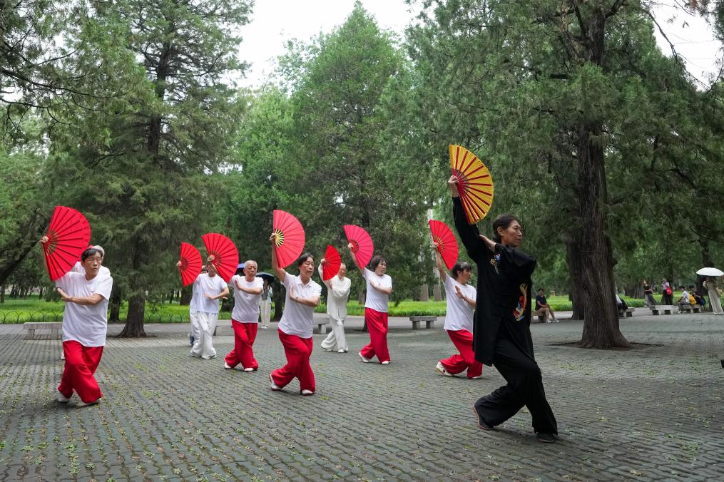 在北京天坛公园,市民在练习太极功夫扇。新华社记者 鞠焕宗 摄