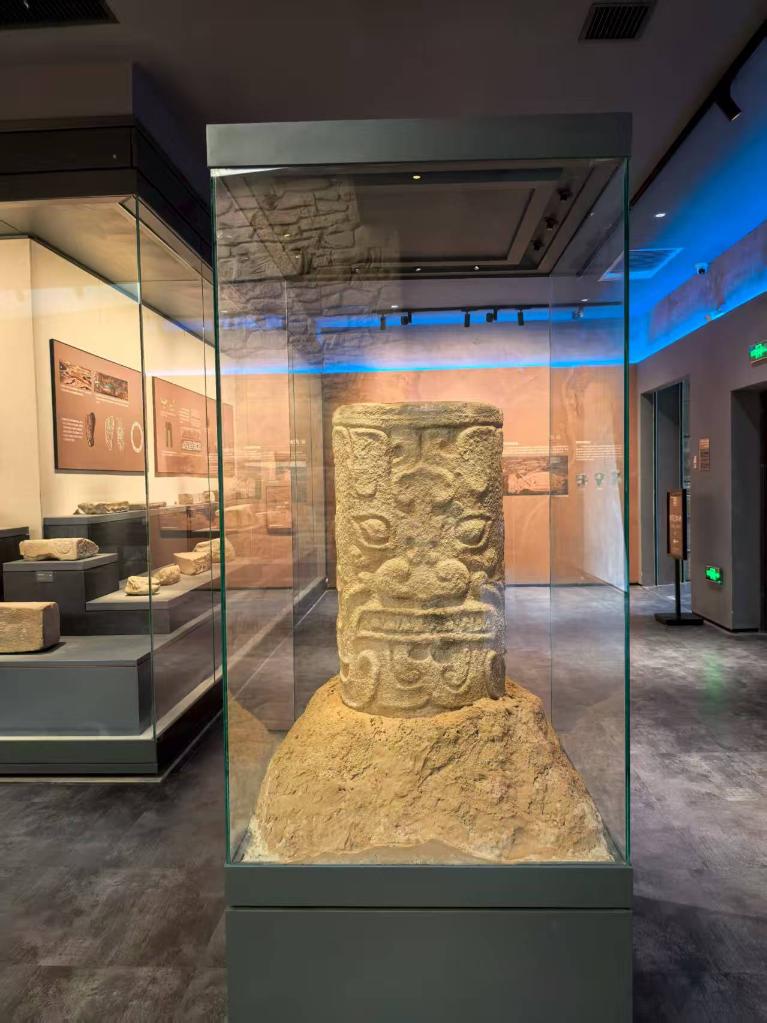 珍藏于石峁博物馆的柱体双神面大石雕。新华社记者 张京品 摄