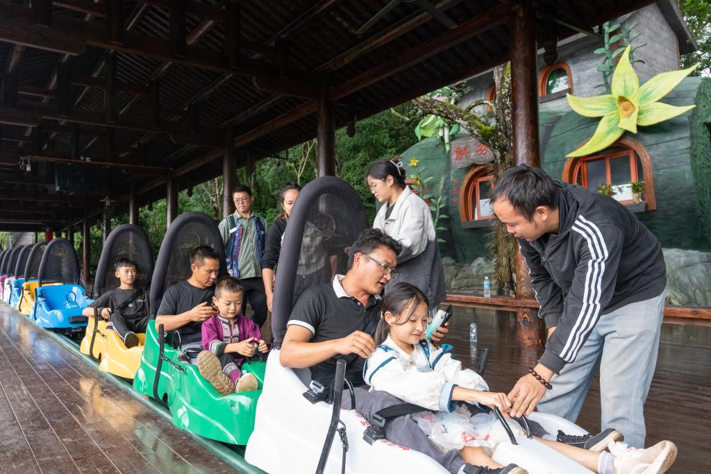 8月27日,游客在广南县六郎城村“六郎城·仙草秘境”景区乘坐小滑车游览。